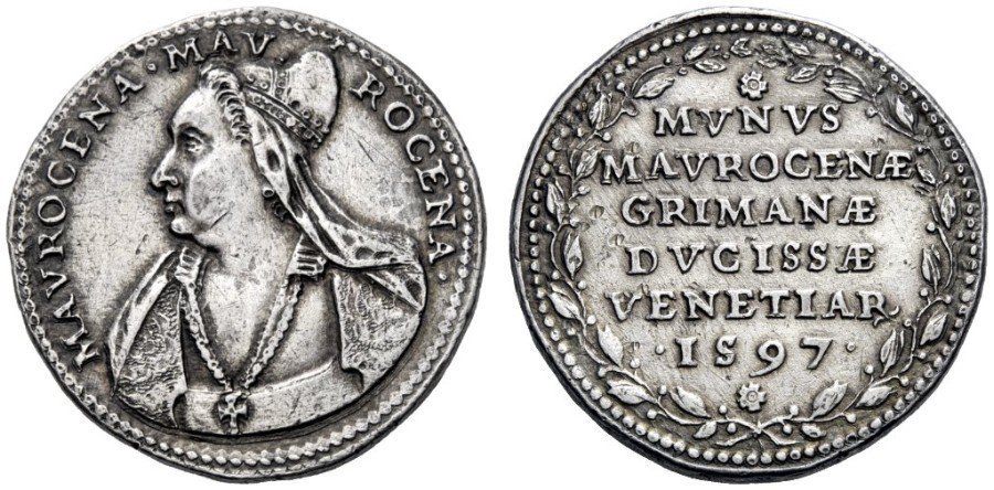 Morosina Morosini 1597 -V701 Dritto: MAVROCENA • MAV _ ROCENA Busto velato, drappeggiato e con corno dogale leggermente volto a sx | |