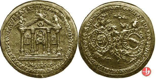 Chiesa di San Simeone a Zara 1600 -V705 Dritto: NOVM • CONSTRVVNT • TEMPLV • VETERE • EVERSO • TEMPORE BELLI • CONTRA • TVRCAS • ACTI • Prospetto anteriore della Chiesa di San Simeone a Zara in esergo: • MCCCCCC Stemmi affiancati entro cornici e tra rami | |