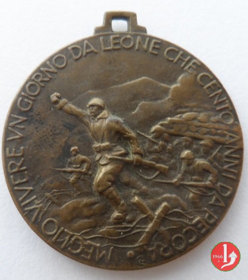 Associazione Naz. del Fante - Meglio vivere un giorno da leone Dritto: MEGLIO VIVERE VN GIORNO DA LEONE CHE CENTO ANNI DA PECORA Fanti all'attacco verso sx, presso trincea in basso: Monogramma CMA Particolare centrale dell'Altare della Patria sulla base: A • N • F • _ A • XIII | |