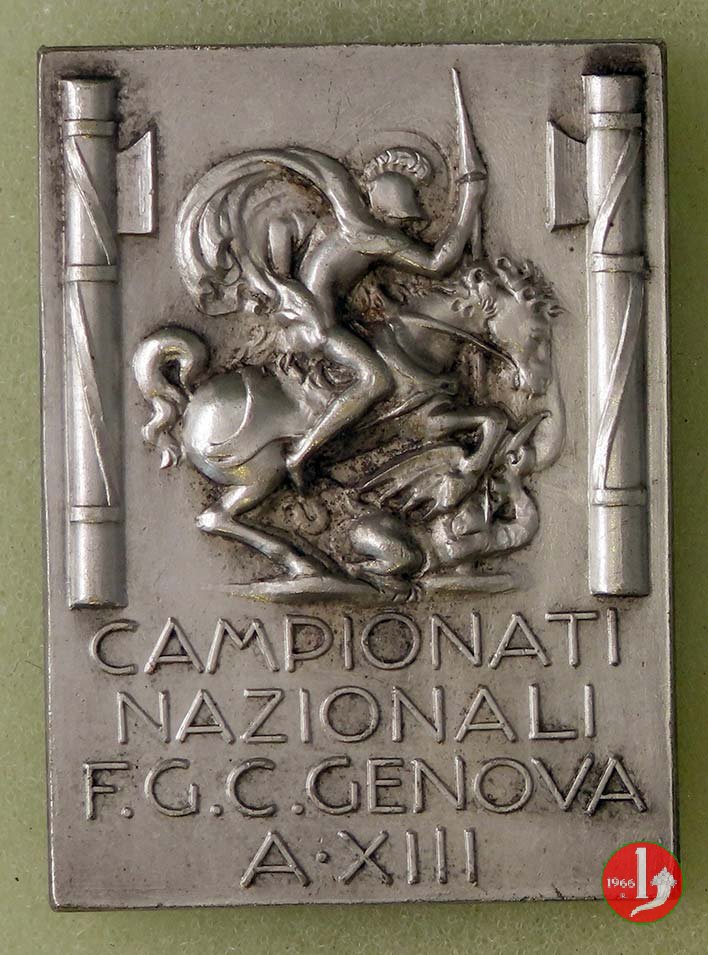Campionati Nazionali FGC Genova -C- Dritto: San Giorgio a cavallo verso dx combatte con il drago tra due fasci verticali con lame convergenti sotto: CAMPIONATI = NAZIONALI = F.G.C. GENOVA = A • XIII | |