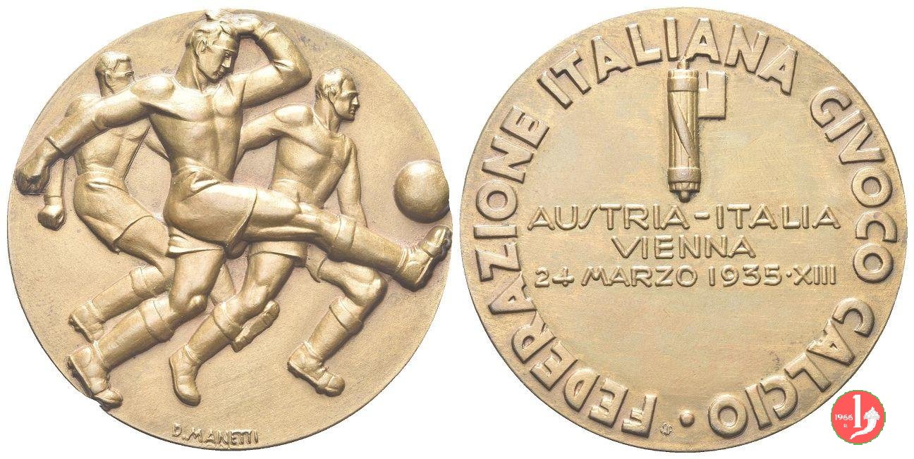 Federazione Italiana Gioco Calcio -C- Dritto: tre calciatori in azione verso dx in basso: D. MANETTI fascio verticale con lama a dx sotto: AUSTRIA - ITALIA = VIENNA = 24 MARZO 1935 • XIII | |