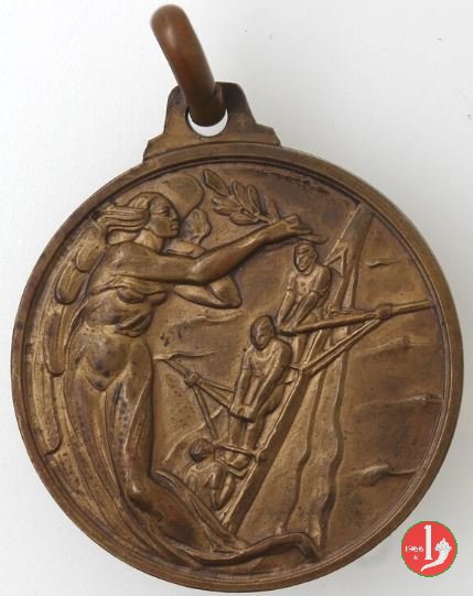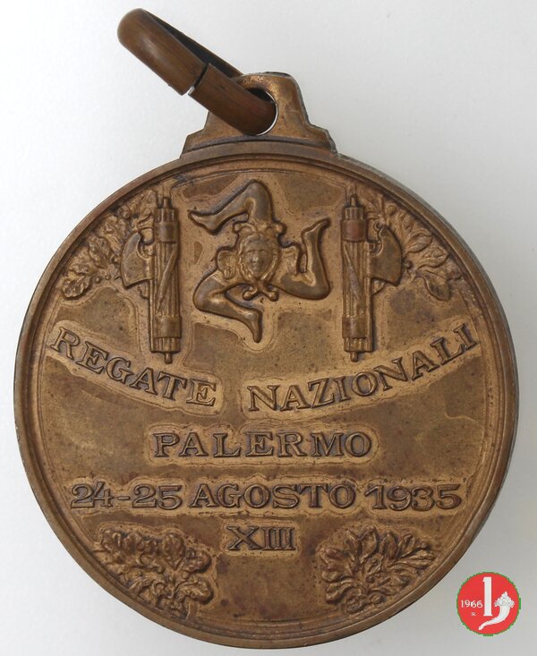 Regate Nazionali Palermo 1935 -C- Dritto: figura femminile della Vittoria alata, regge ramo d'alloro su canua in mare Verso: in alto: trinacria tra fasci verticali con lame divergenti e rami d'alloro e quercia nel campo: REGATE NAZIONALI = PALERMO = 24-25 AGOSTO 1935 = XIII | |