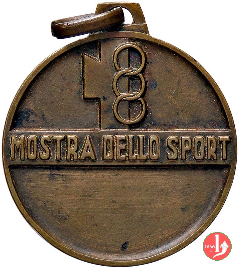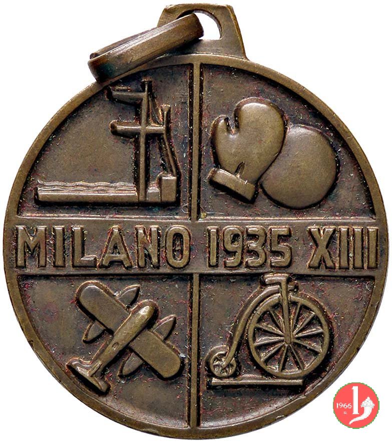 Mostra dello Sport Milano 1935 -C- Dritto: entro nastro centrale orizzontale: MILANO 1935 XIII nel campo quadripartito: Piscina con trampolino per tuffi guanti da box aliscafo dall'alto velocipede in prospetto laterale | |