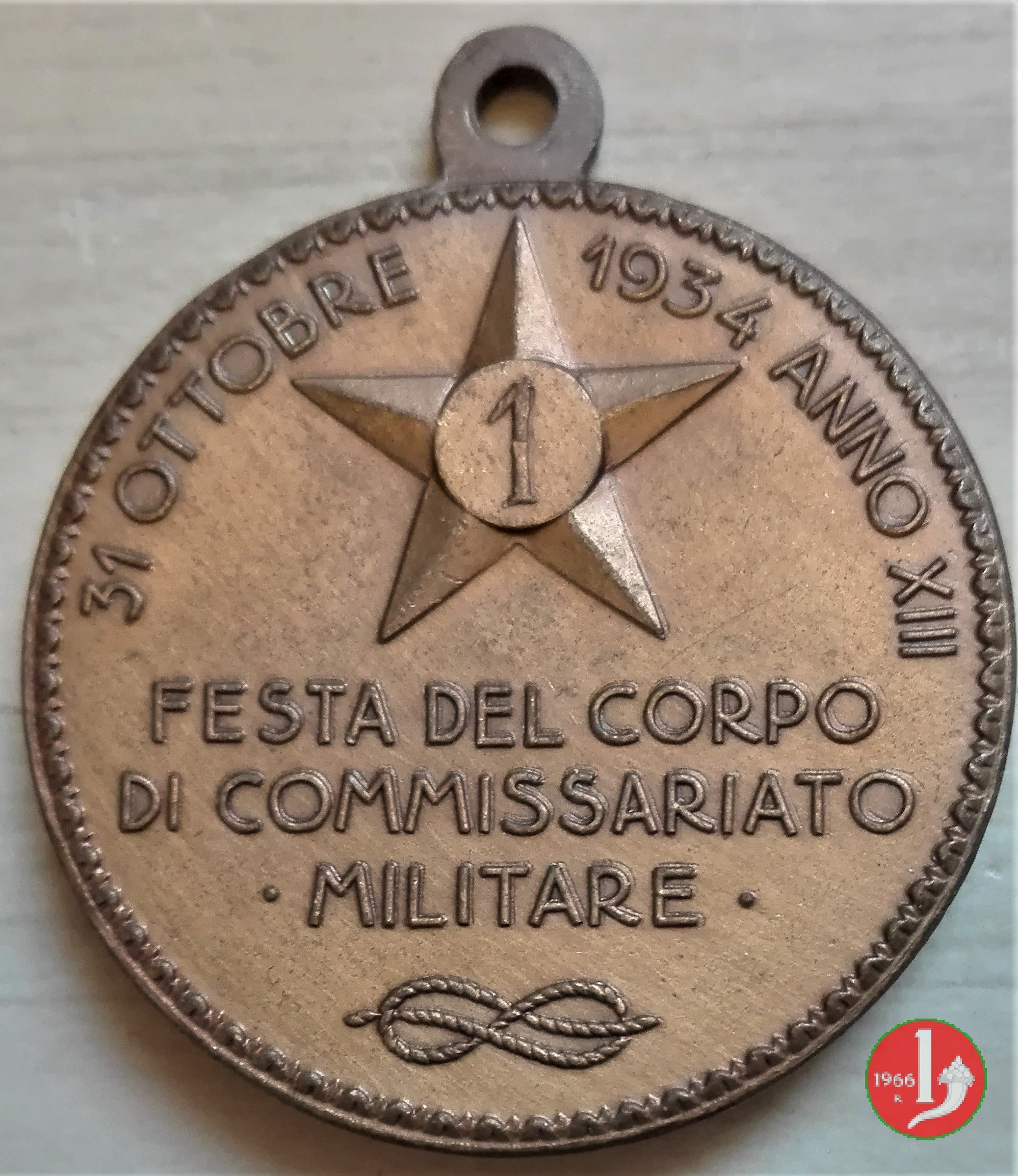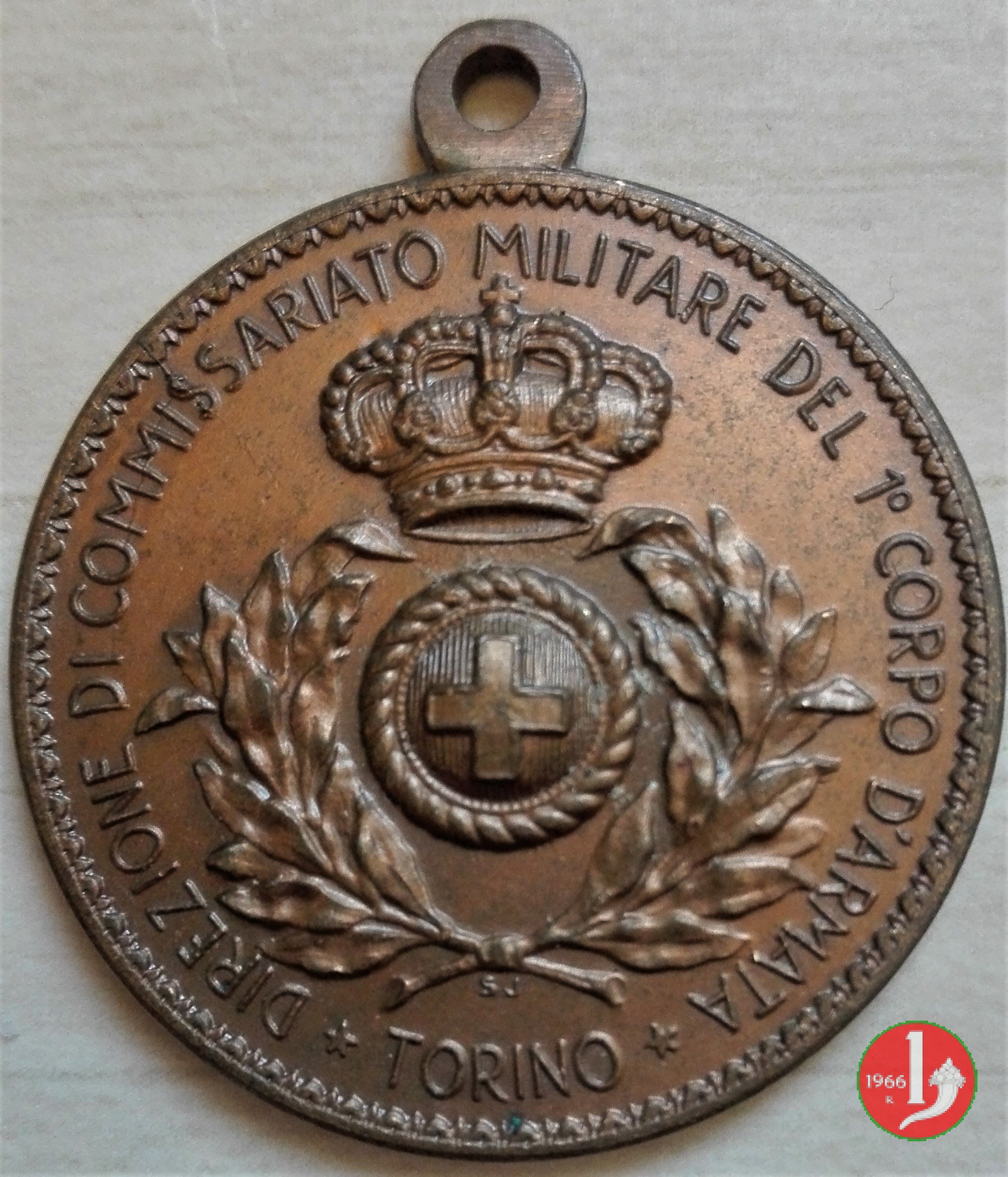 Commissariato Militare 1° Corpo d'Armata Torino -C- Dritto: DIREZIONE DI COMMISSARIATO MILITARE DEL 1° CORPO D'ARMATA = * TORINO * Logo con Croce entor medaglia contornata da festone tra rami d'alloro e sormontata da corona sotto: SJ sotto: FESTA DEL CORPO = DI COMMISSARIATO = • MILITARE • = nodo d'amore | |