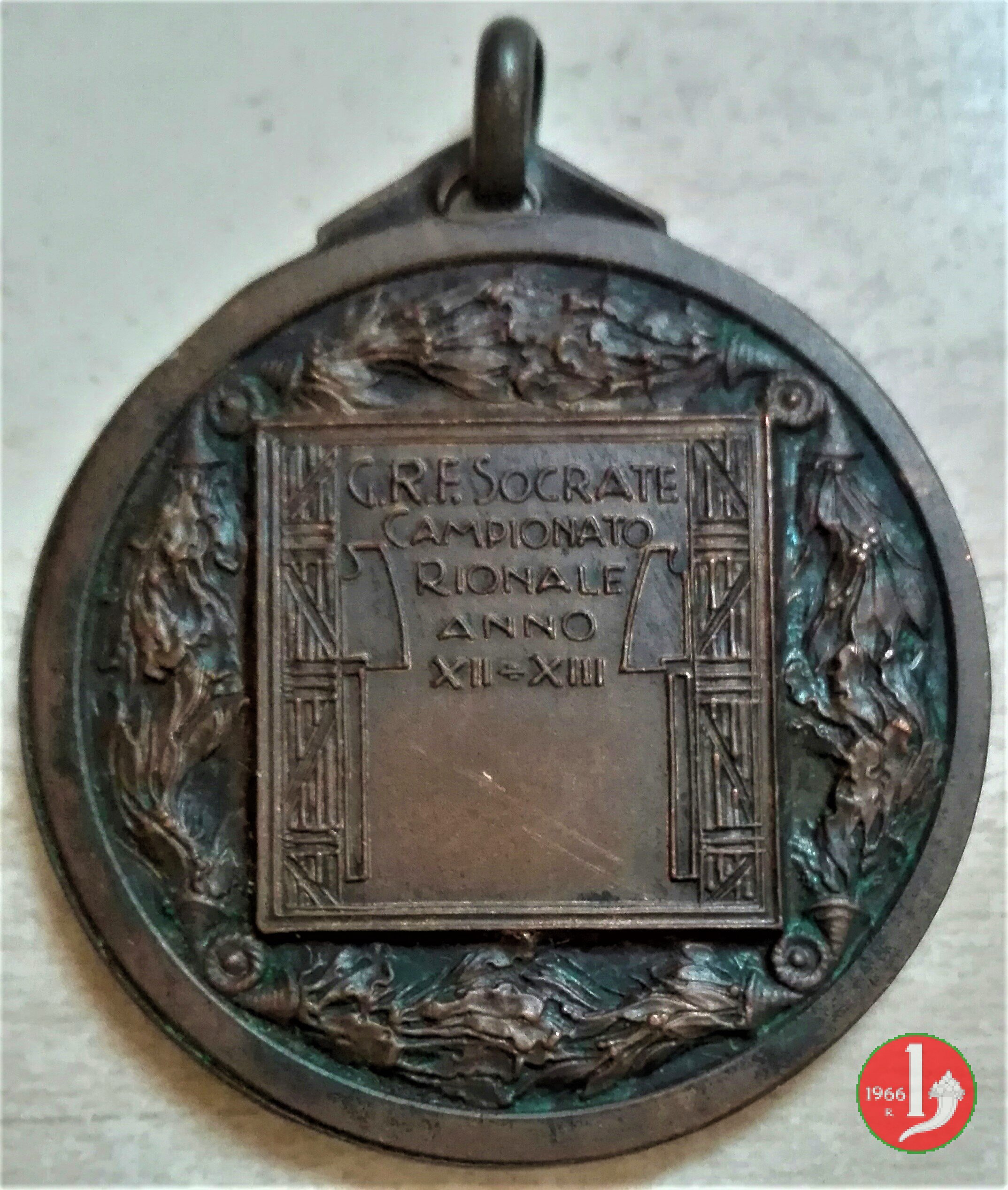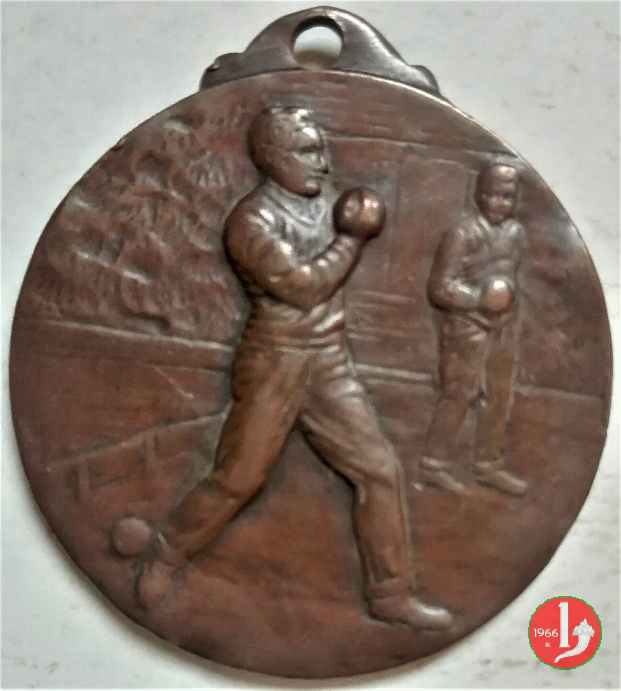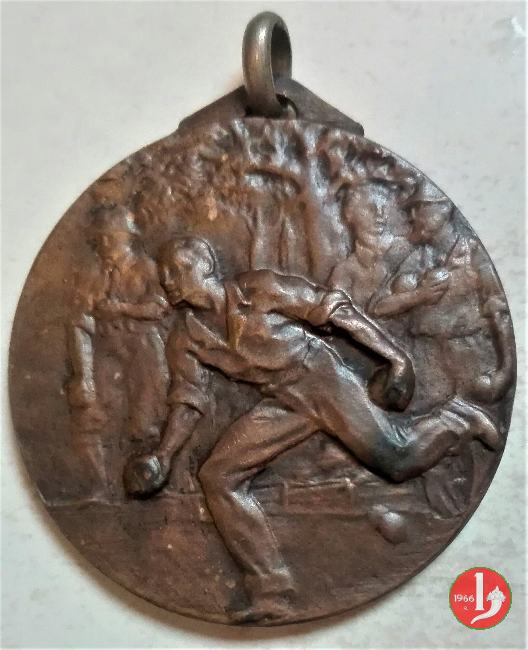 Gruppo Rionale Socrate - Milano -C- Dritto: atleta impegnato nel lancio delle bocce verso sx, sullo sfondo altri tre giocatori. Verso: entro targa tra fronde di alloro e quercia sui quattro lati: tra fasci verticali con lame convergenti al centro G.R.F. SOCRATE = CAMPIONATO = RIONALE = ANNO = XII - XIII | |