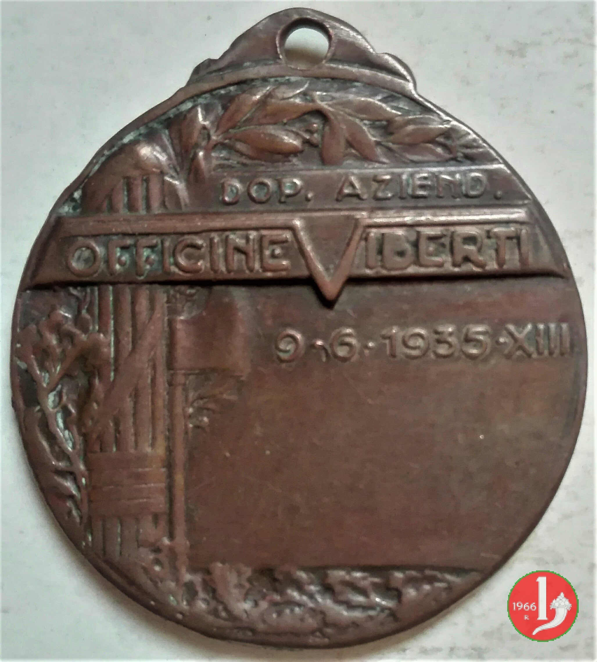 Officine Viberti - Torino - Gioco Bocce -C- Dritto: due Atleti in piedi impegnati nel tiro delle bocce verso dx Verso: fascio verticale con lama a dx tra fronde d'alloro, in alto: DOP. AZIEND. su nastro orizzontale: OFFICINE VIBERTI sotto entro targa: 9 • 6 • 1935 • XIII in esergo: foglie di quercia | |