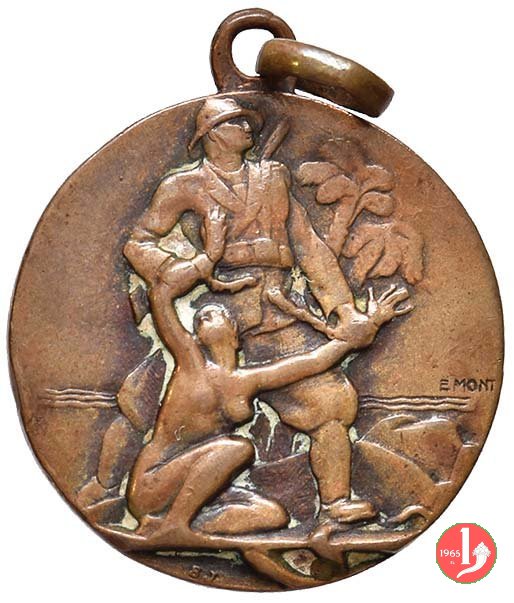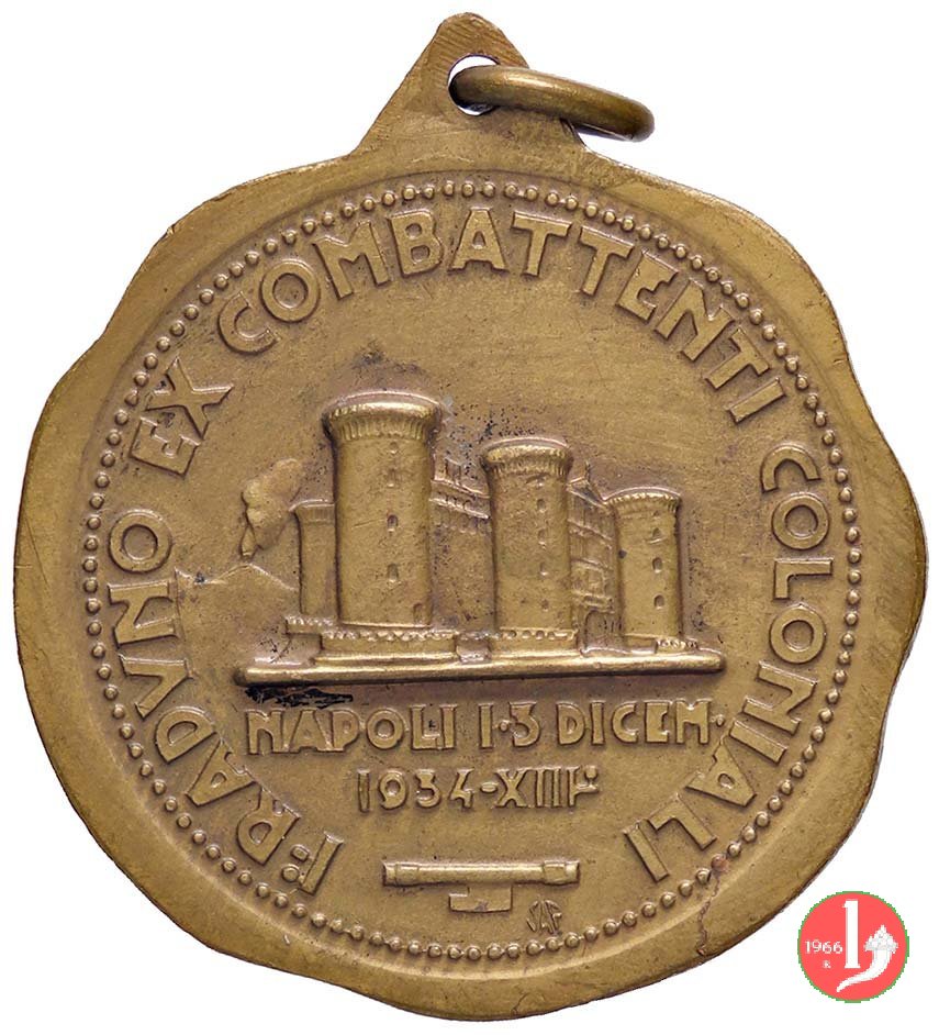 Raduno Ex Combattenti Coloniali Napoli 1934 -C- Dritto: testa di centurione coloniale con elmo a dx, tra palme e fascio verticale con lama a dx sotto: D.MANETTI vista del Maschio Angioino in esergo: NAPOLI 1-3 DICEM • = 1934 • XIII° sotto: fascio orizzontale con lama in basso SAF | |