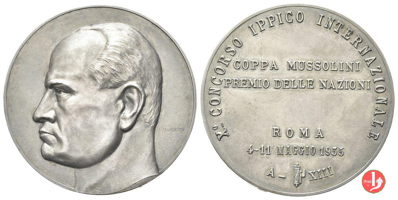 Concorso Ippico Internazionale - Coppa Mussolini 1935 -C- Dritto: Testa nuda di Mussolini a sx nel campo a dx: P. TAILETTI nel campo: COPPA MUSSOLINI = PREMIO DELLE NAZIONI sotto: ROMA = 4-11 MAGGIO 1935 in basso ai lati di fascio verticale con lama a dx: A- _ XIII | |
