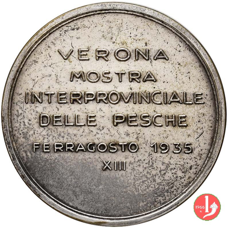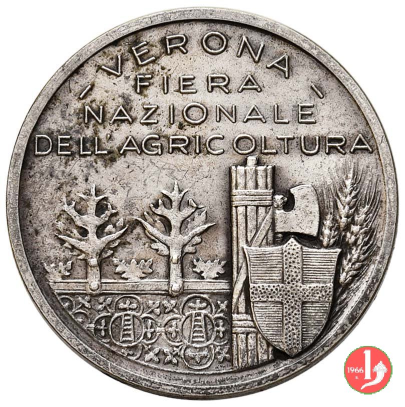 Verona - Mostra delle Pesche 1935 -C- Dritto: - VERONA - nel campo in alto: FIERA = NAZIONALE = DELL'AGRICOLTURA Stemma di Verona in scudetto su spighe e fascio verticale con lama a dx e sullo sfondo alberi, arbusti e, in esergo, decorazione contenete il logo della scala tra foglie | |