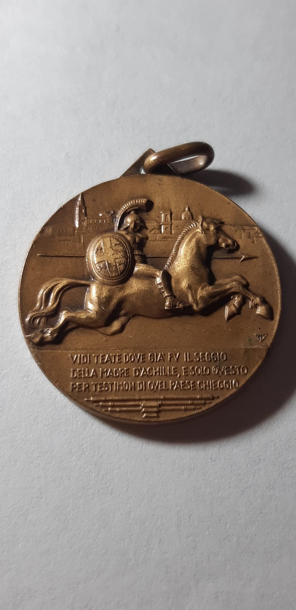 Chieti alla Divisione Gran Sasso 1935 -C- Dritto: Achille su destriero, in corsa verso dx, regge scudo crociato e sullo sfondo la città di Chieti in esergo, su fascio orizzontale: VIDI TEATE DOVE GIA' FV IL SEGGIO = DELLA MADRE D'ACHILLE, E SOLO QVESTO = PER TESTIMON DI QVEL PAESE CHEGGIO entro cerchio perlinato: mano regge gladio verticale con sull'elsa FERT entro paesaggio montuoso ai lati: MORIS = CITIVS _ QVAM = DESERERE | |