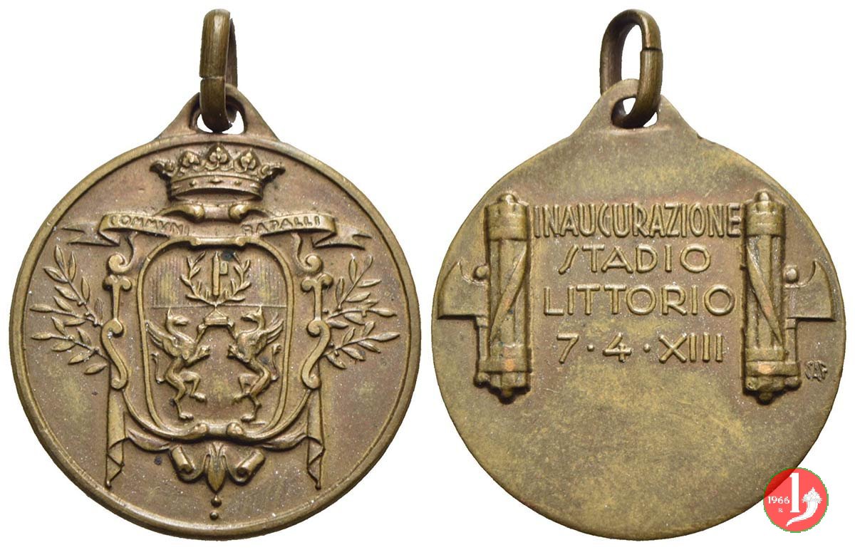 Inaugurazione Stadio Littorio a Rapallo 1935 -C- Dritto: Stemma coronato della Città di Rapallo tra rami d'alloro e su cartiglio con motto in nastro COMMVNI _ RAPALLI Verso: nel campo tra fasci verticali con lame divergenti: INAUGURAZIONE = STADIO = LITTORIO = 7 • 4 • XIII a dx presso il bordo: SAF | |