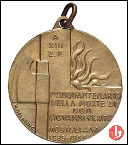 Modigliana - Don Giovanni Verità Dritto: busto a sx con cappello, giacca e sciarpa a dx, dietro alla spalla: LAGHI in alto: A. = XIII = E.F. sotto: I° CINQUANTENARIO = DELLA MORTE DI = DON = GIOVANNI VERITA' = MODIGLIANA = 1885-1935 a sx, presso il bordo: M. NELLI INC. | |