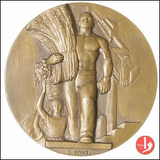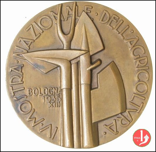 Bologna - Mostra Nazionale dell' Agricoltura Dritto: figura maschile in piedi di fronte con fascio di grano, dietro a sx donna con cesta di frutti in capo; a dx le due Torri di Bologna e vista della sede espositiva in esergo: B. BOARI Attrezzi Agricoli con fascio nel campo a sx: BOLOGNA = 1935 = XIII in basso a dx: SAF | |
