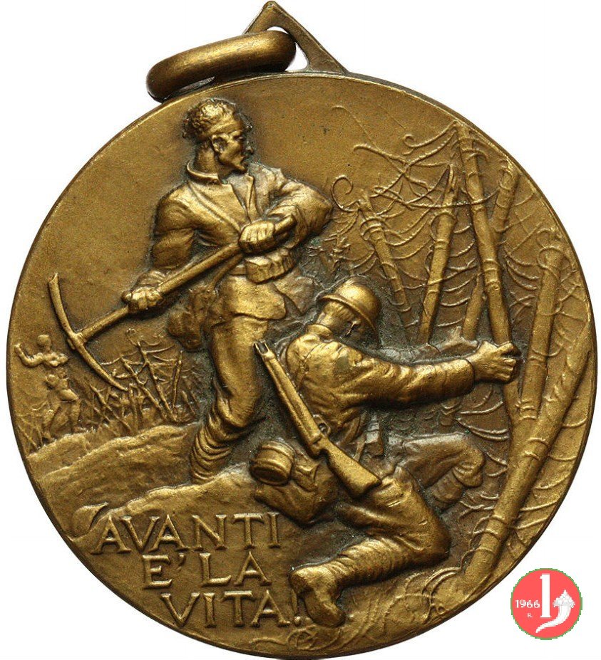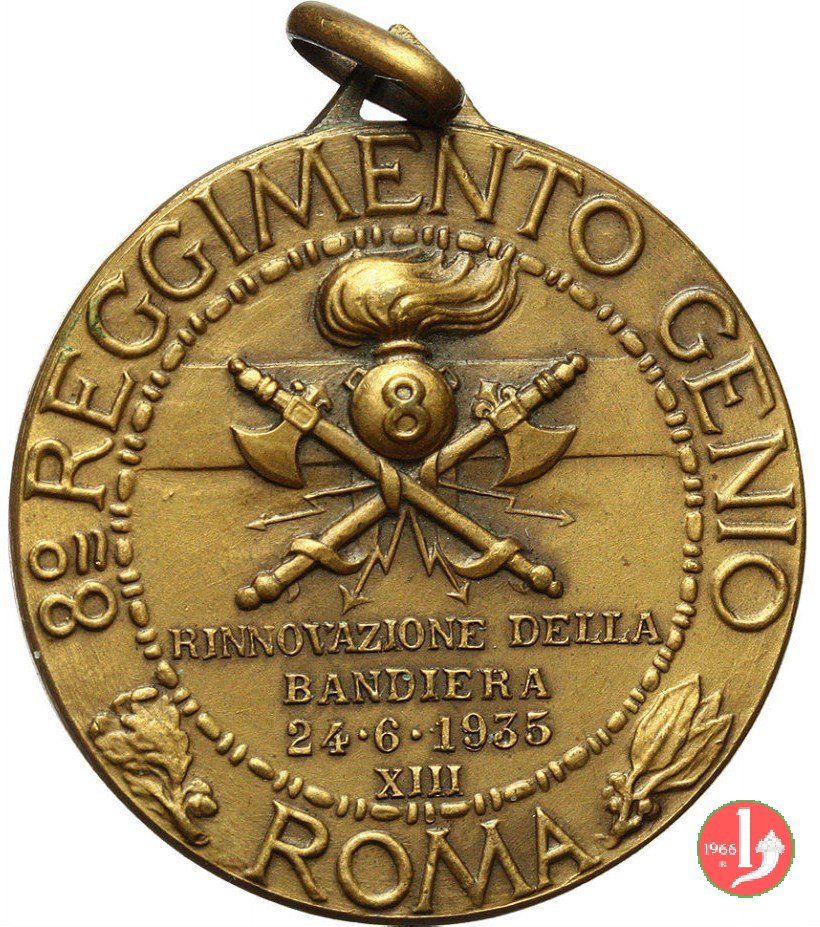 8° Reggimento Genio Roma -C- Dritto: Minatori all'opera presso trincea: uno in piedi a dx con picco, l'altro seduto a dx intento ad aprire varco in basso,a sx: AVANTI = E' LA = VITA! logo del Reggimento: miccia ardente su ascie decussate e fulmini sotto: RINNOVAZIONE DELLA = BANDIERA = 24 • 6 • 1935 = XIII | |