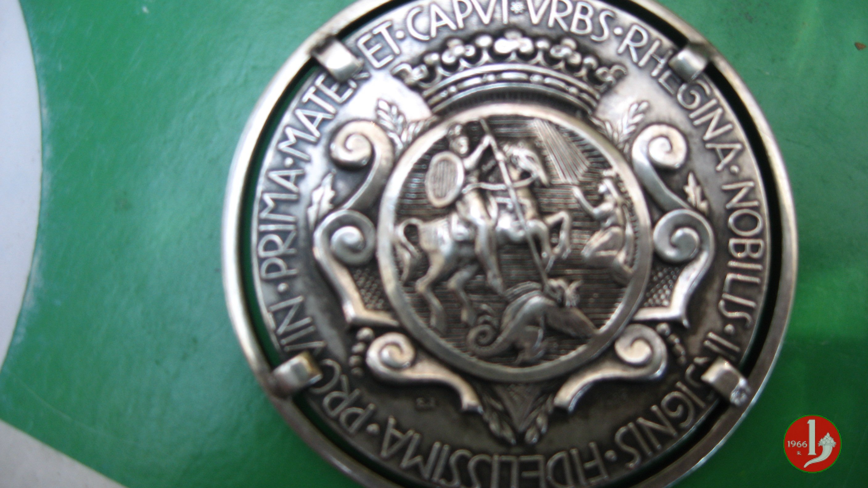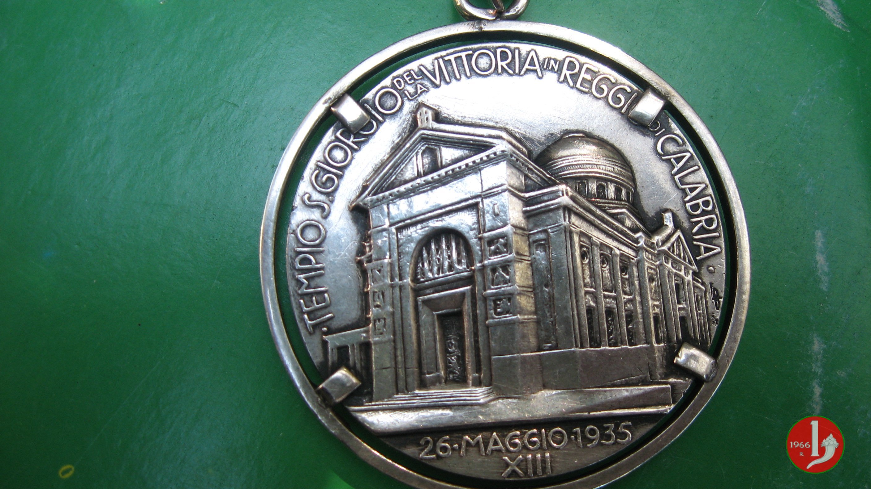 Tempio S. Giorgio Reggio Calabria -C100 Dritto: • TEMPIO S. GIORGIO DELLA VITTORIA REGGIO CALABRIA • veduta della Chiesa a dx, monogramma: LU sotto: 26 MAGGIO 1935 = XIII Stemma coronato, entro cartiglio fregiato da foglie d'alloro e quercia, con San Giorgio verso dx che uccide il drago e B.V., a sx, orante sotto, a sx: S.J. | |