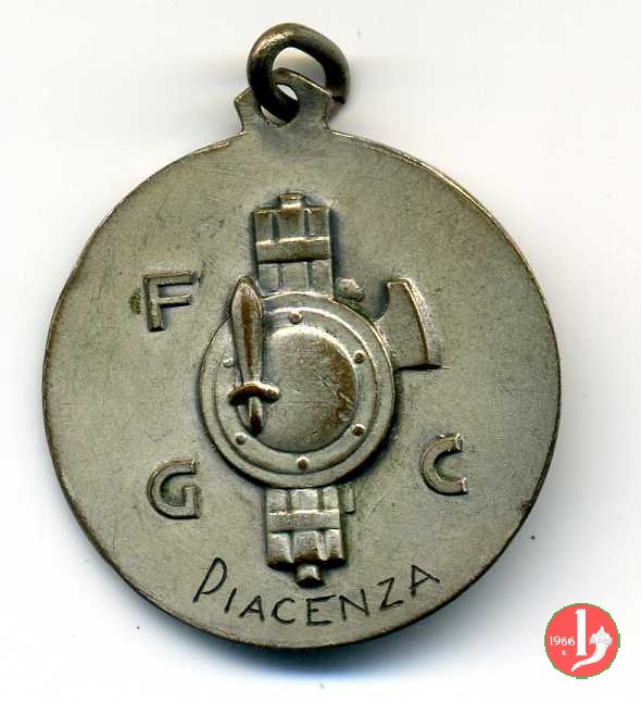 FGC - Piacenza -C- Dritto: F = G _ C logo dei Fasci Giovanili di Combattimento: gladio e scudo su fascio verticale con lama a dx sotto: PIACENZA tre atleti in corsa, verso sx sotto: III° PREMIO | |