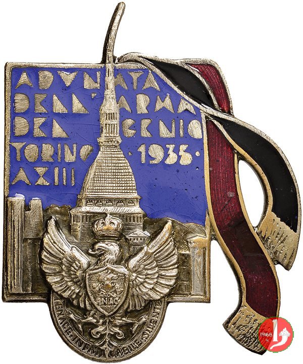 Adunata Arma del Genio in Torino -C- Dritto: nel campo, in alto, su smalti blu: ADVN _ ATA = DELL' _ ARMA = DEL _ GENIO = TORINO _ • 1935 • = XIII Mole Antonelliana con fascio a sx verticale con lama a dx con aquila coronata ANAC a dx: due stole sventolanti nera e rossa in esergo, circolarmente: TENACE • INFATICABILE • SILENTE | |