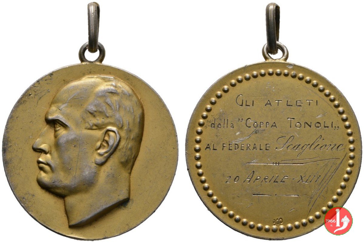 Coppa Tonoli -C- Dritto: testa di Mussolini a sx Verso: nel campo, inciso: GLI ATLETI = della "COPPA TONOLI" = AL FEDERALE Scaglione = - = 20 APRILE XIII = - • - | |