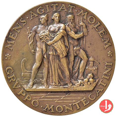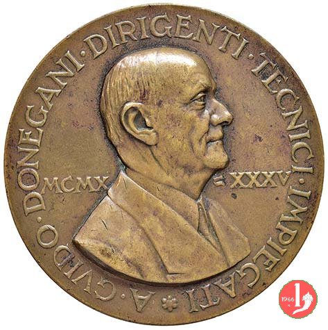 Donegani Guido - Gruppo Montecatini -C106 Dritto: * A • GVIDO • DONEGANI • DIRIGENTI • TECNICI • IMPIEGATI busto a dx di Donegani con giacca, camicia e cravatta ai lati: MCMX _ =XXXV tre figure allegoriche in piedi presso prua di nave: Cerere tra Ermes e Nettuno sulla base, a dx: MISTRVZZI | |