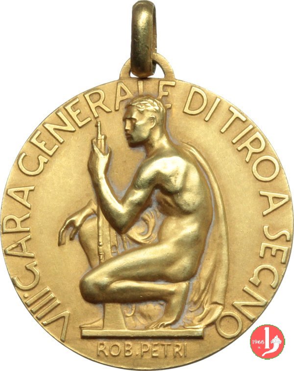 VIII Gara generale di Tiro a segno Dritto: VIII° GARA GENERALE DI TIRO A SEGNO atleta, con fucile, chino verso sx in esergo: ROB. PETRI in basso, a dx, monogramma: CDF fascio verticale su gagliardetti in basso, a dx, monogramma: CDF | |