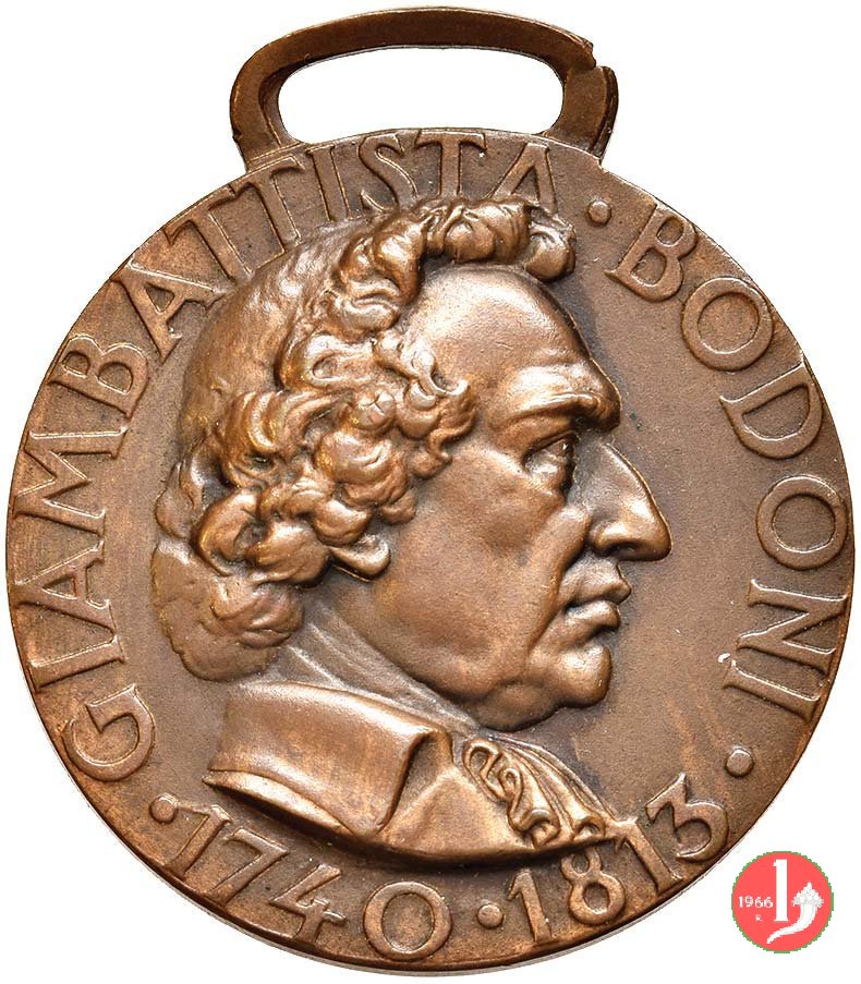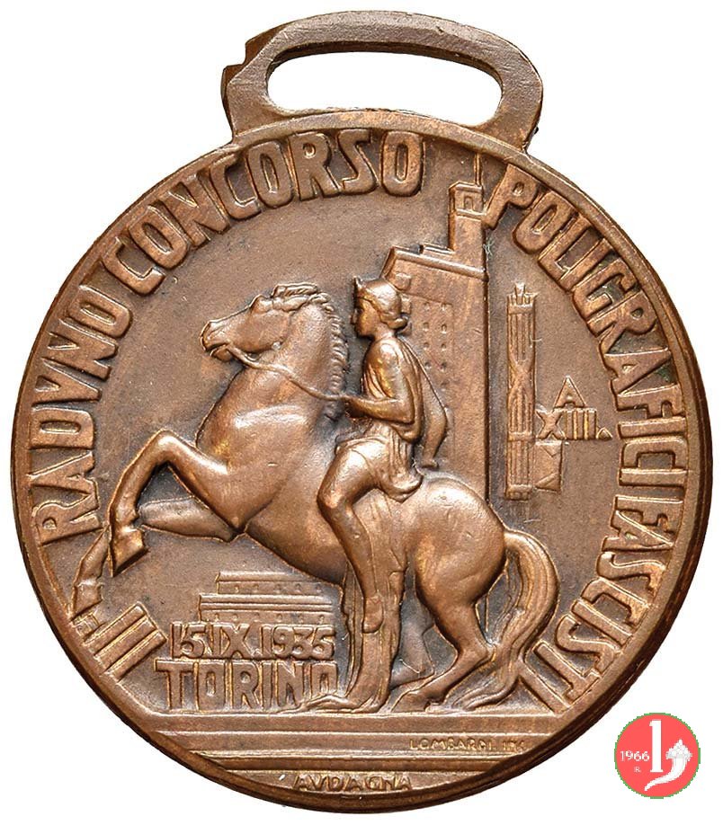 Concorso Poligrafici Torino 15-09-1935 -C- Dritto: GIAMBATTISTA • BODONI = • 1740 • 1813 • busto a dx con camicia e foulard figura femminile su cavallo rampante a sx e sullo sfondo la Torre Littoria di Torino nel campo a dx: fascio verticale con lama a dx e A = XIII. in basso a sx: 15. IX. 1935 = TORINO sotto: LOMBARDI INC. in esergo: AVDAGNA | |