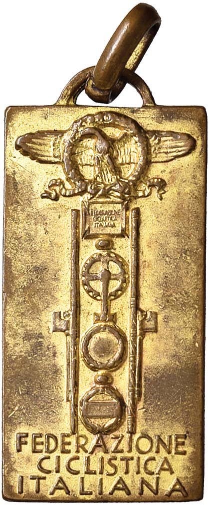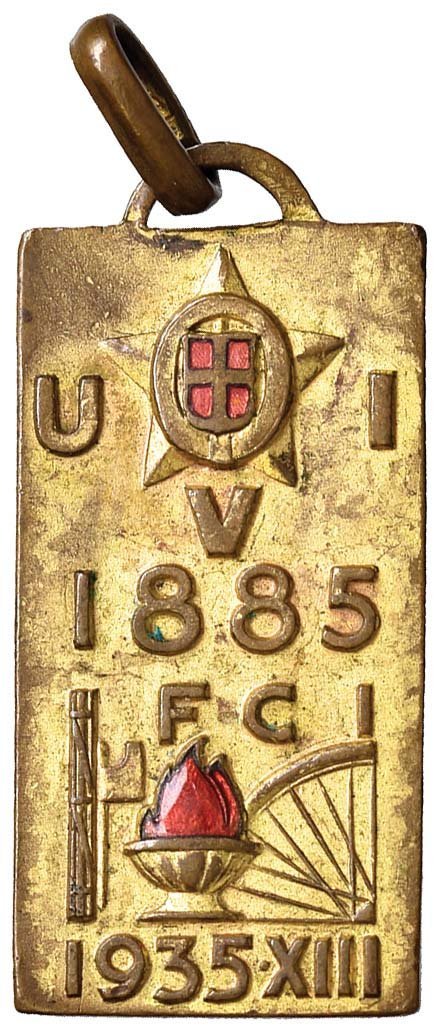 Federazione Italiana Ciclisti 1935 -C- Dritto: Aquila legionaria entro ghirlanda su labaro romano con ai lati fasci in basso: FEDERAZIONE = CICLISTICA = ITALIANA nel campo: 1885 = FCI fascio, fiamma ardente e parte di ruota di bicicletta in basso: 1935 • XIII | |