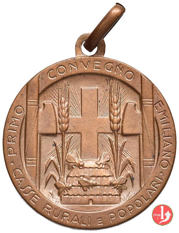 Bologna - Convegno Casse Rurali 1935 -C- Dritto: PRIMO _ CONVEGNO _ EMILIANO = • CASSE RURALI E POPOLARI • tra fasci verticali a lame convergenti e spighe di grano: Croce raggiante su arnia con api | |