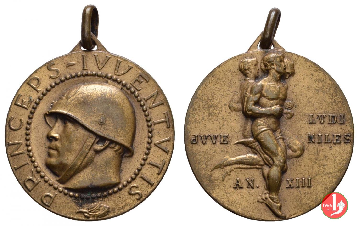 Giochi della Gioventú -C- Dritto: PRINCEPS - JVVENTVTIS (foglie di quercia) entro cerchio perlinato: testa elmata a sx di Mussolini nel campo, ai lati: LVDI = JVVE _ NILES = AN. _ XIII | |