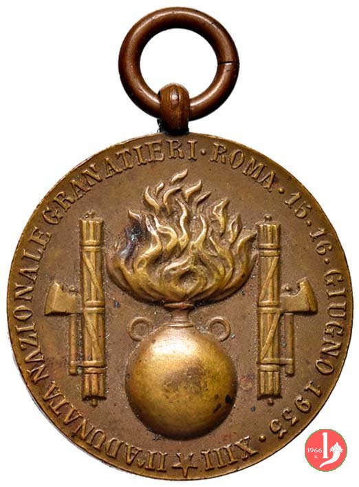 2 - Roma - Adunata Nazionale Granatieri -C- Dritto: ADUNATA NAZIONALE GRANATIERI • ROMA 13 • 16 GIUGNO 1935 XIII * miccia ardente tra fasci verticali con lame contrapposte Il Re in piedi di fronte in basso a dx: Z coronata S.J. | |