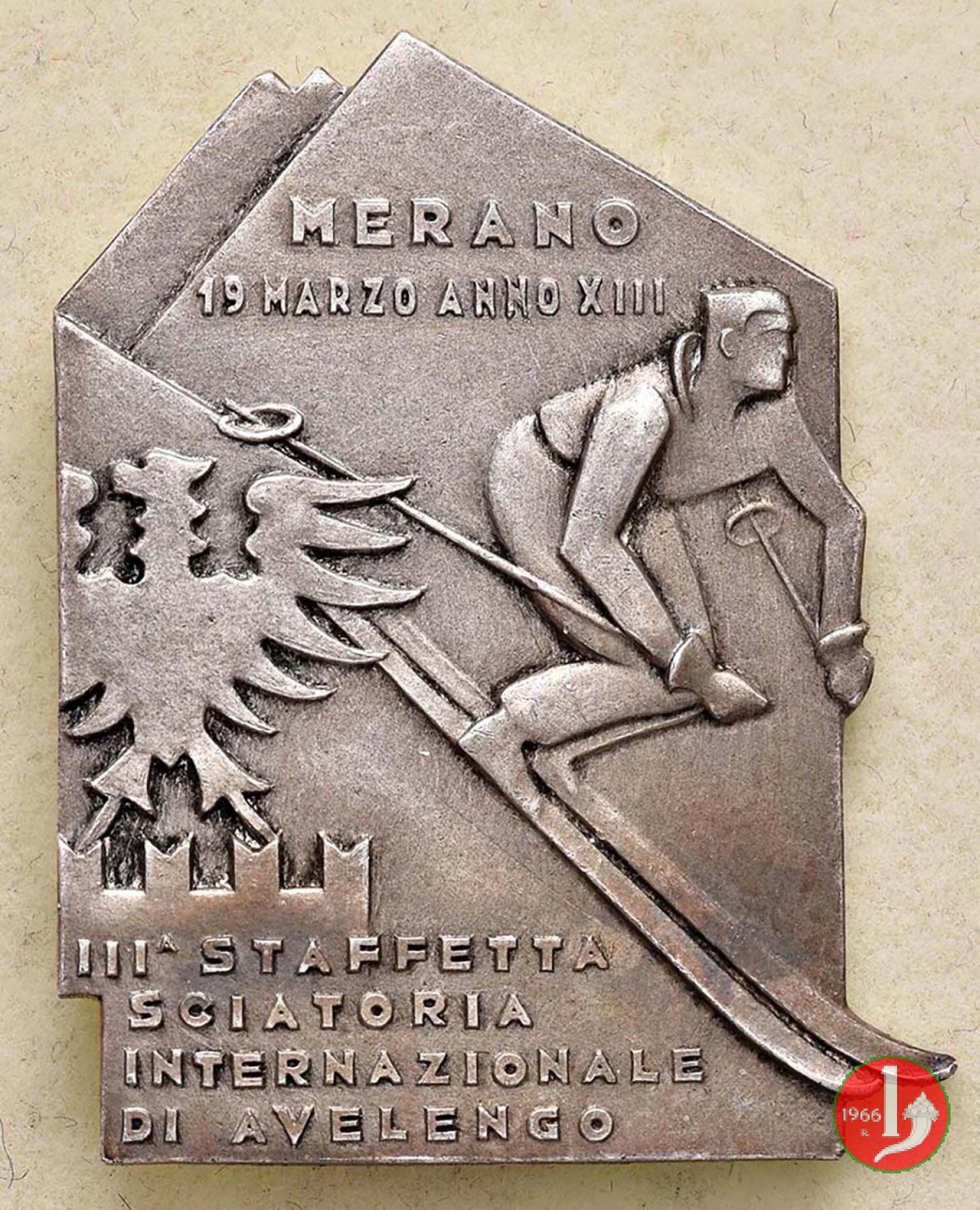 Merano - III Staffetta di Avelengo -C- Dritto: in alto: MERANO = 19 MARZO ANNO XIII Sciatore in discesa verso dx e a sx aquila su merli di torre in basso: III STAFFETTA = SCIATORIA = INTERNAZIONALE = DI AVELENGO | |