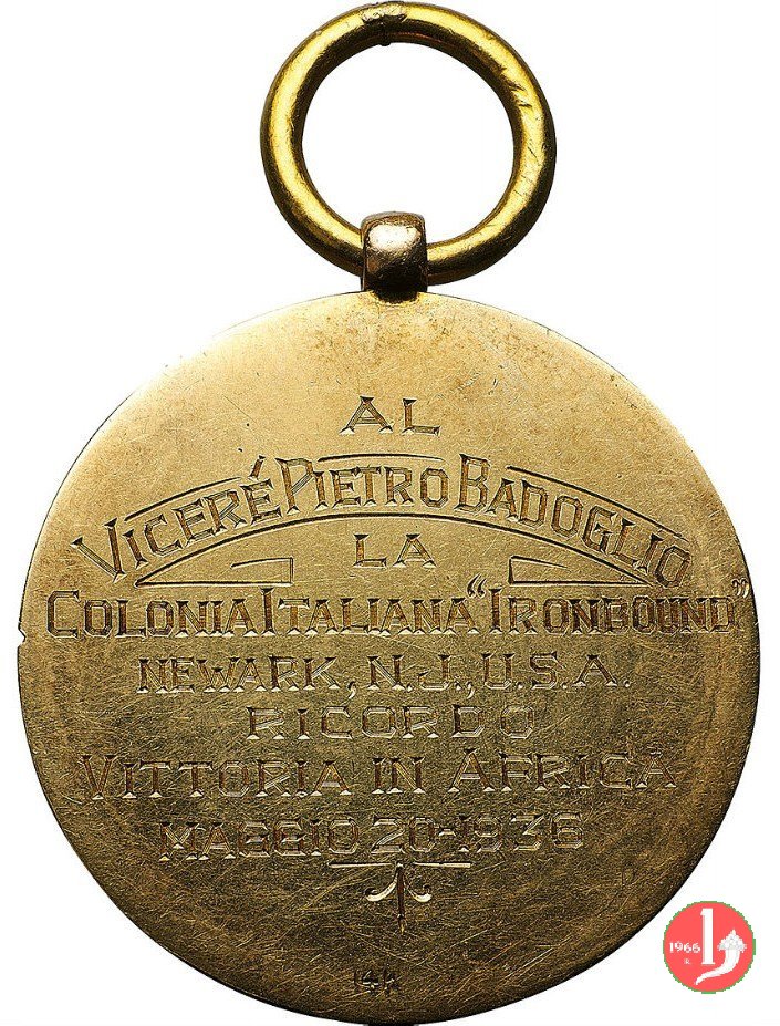 Verso: nel campo: AL = VICERE PIETRO BADOGLIO = LA = COLONIA ITALIANA "IRONBOUND" = NEWARJ, N.J., U.S.A. = RICORDO = VITTORIA IN AFRICA = MAGGIO 20-1936