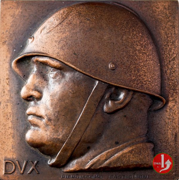 Dritto: busto di Mussolini in uniforme della Milizia a sx, su scure di fascio