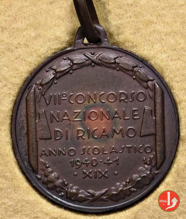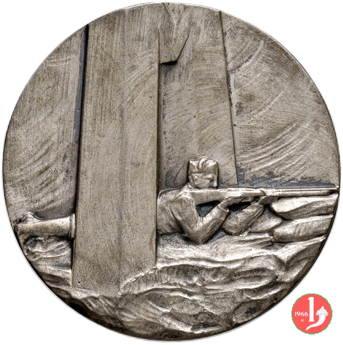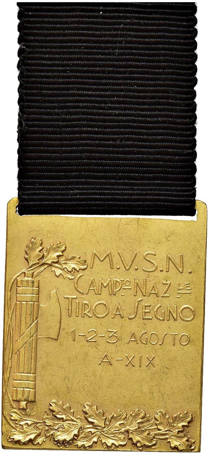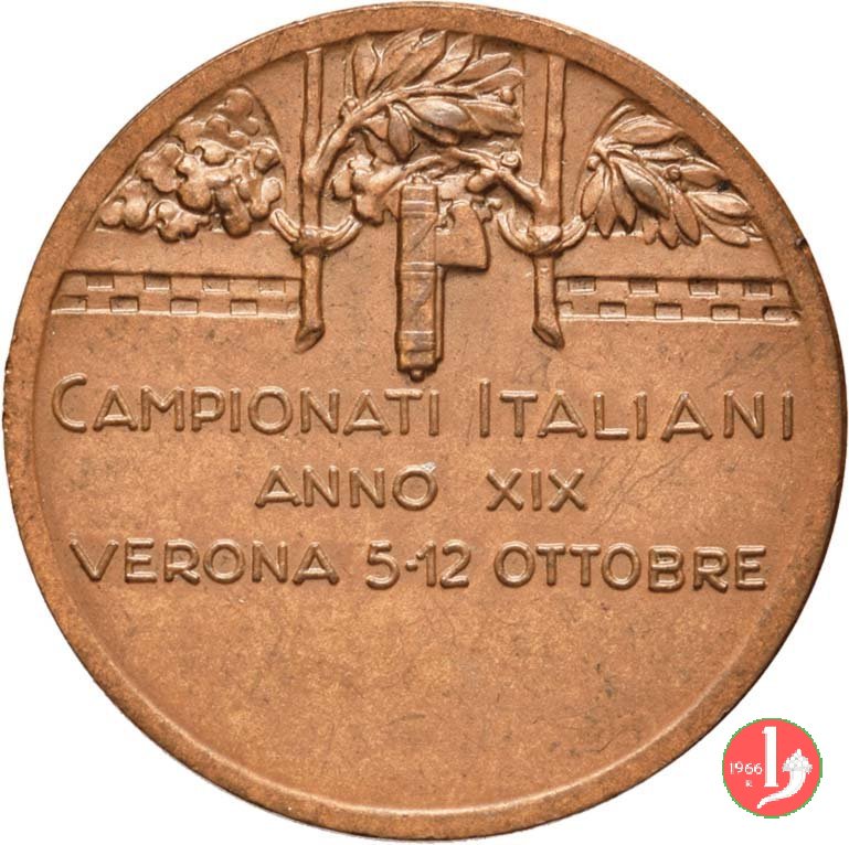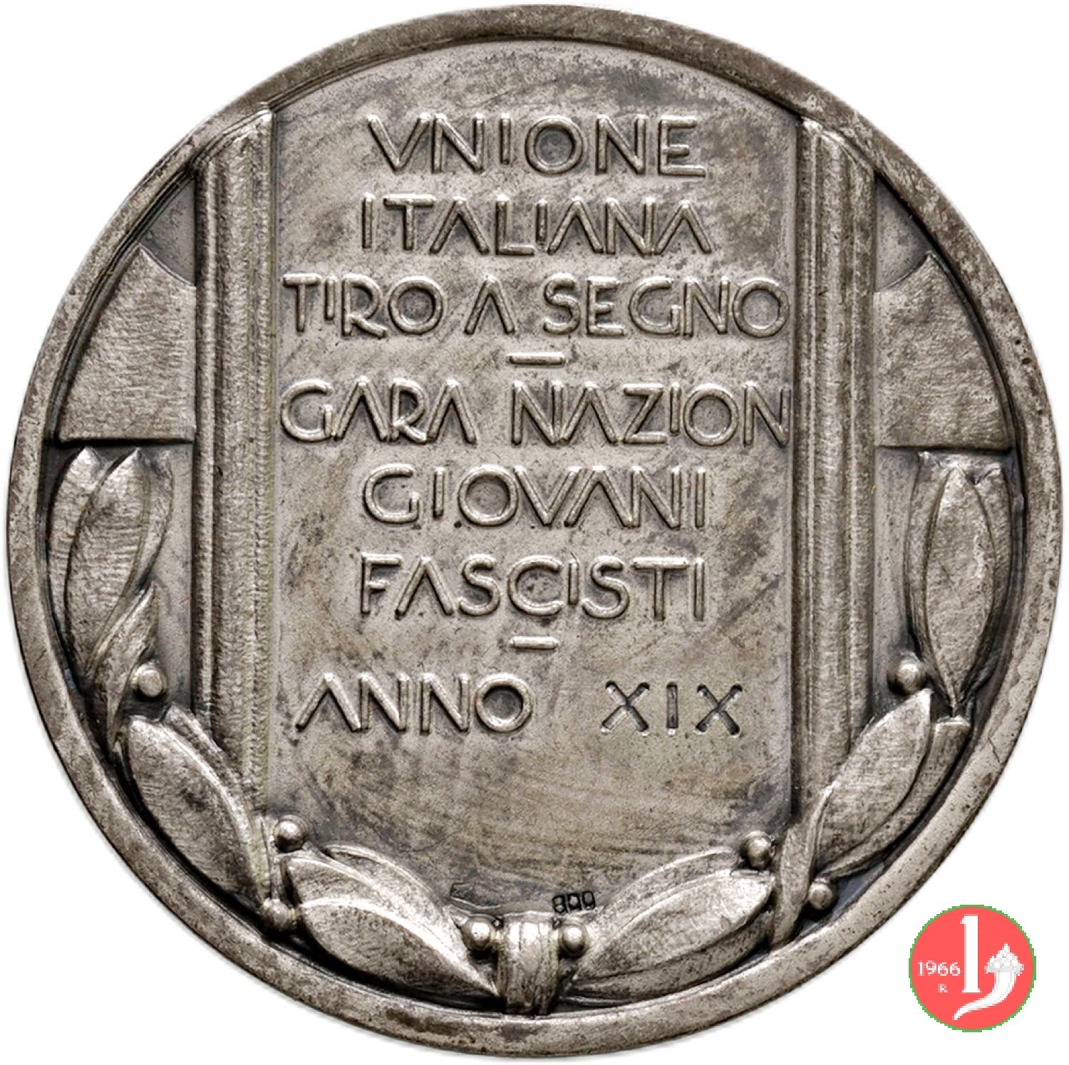 Verso: tra fasci verticali con lame divergenti ornati da semi-serto d'alloro in basso: VNIONE = ITALIANA = TIRO A SEGNO = - = GARA NAZION = GIOVANI = FASCISTI = - = ANNO XIX (inciso)