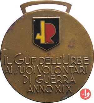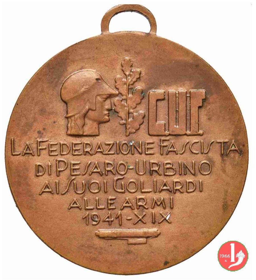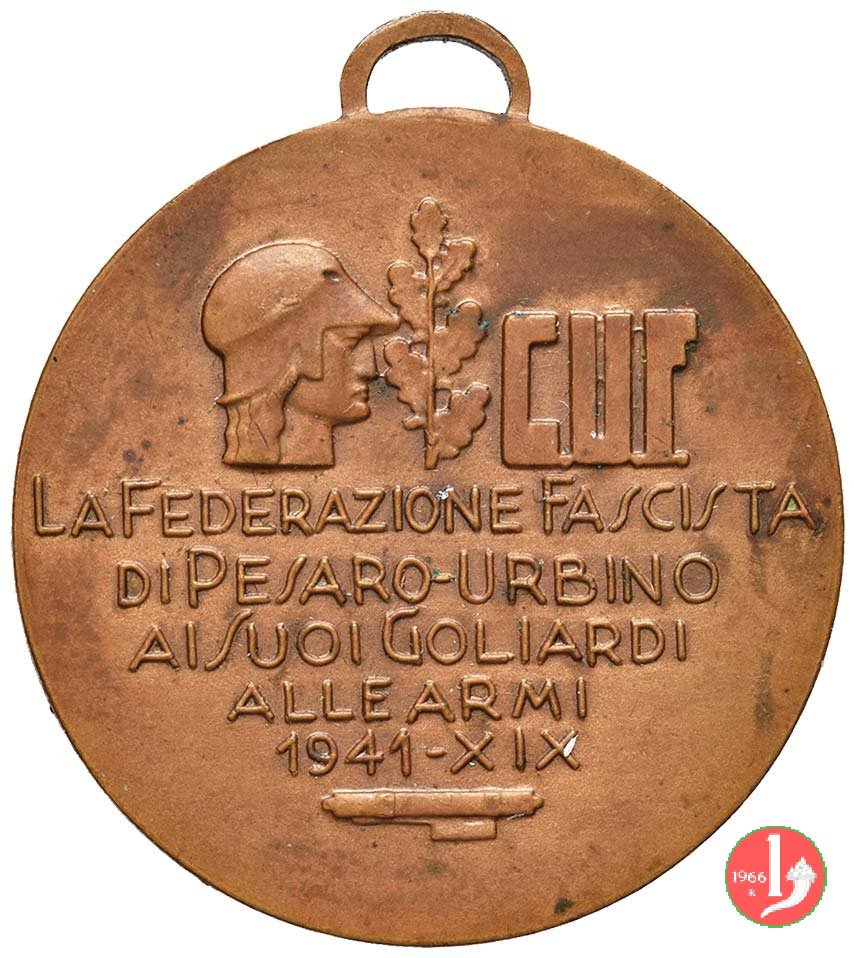 sotto: LA FEDERAZIONE FASCISTA = DI PESARO-URBINO = AI SUOI GOLIARDI = ALLE ARMI = 1941 • XIX