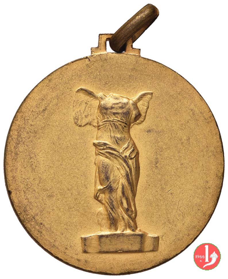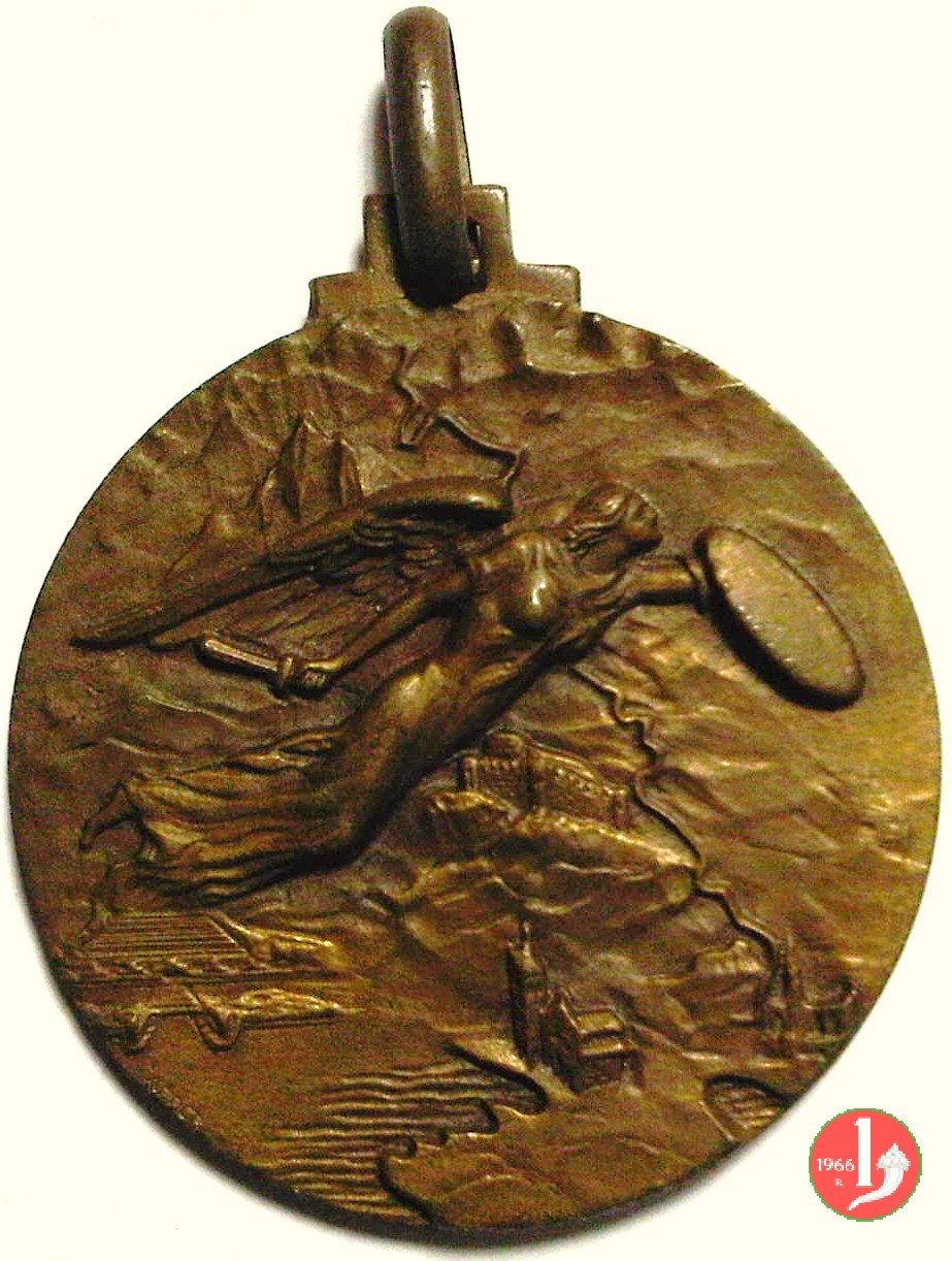 Dritto: La figura allegorica dell'Italia turrita regge fascio e pone serto d'alloro sul capo di ciclista in piedi