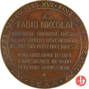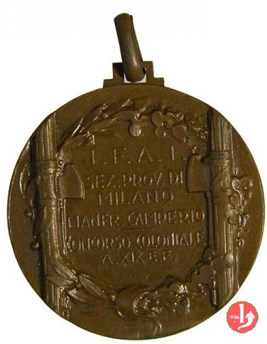 Verso: tra fasci verticali con lame convergenti posti su serto di alloro, entro il quale: I. F. A. I. = SEZ. PROV. DI = MILANO = MANFR. CAMPERIO = - = CONCORSO COLONIALE = A. XIX E. F.
