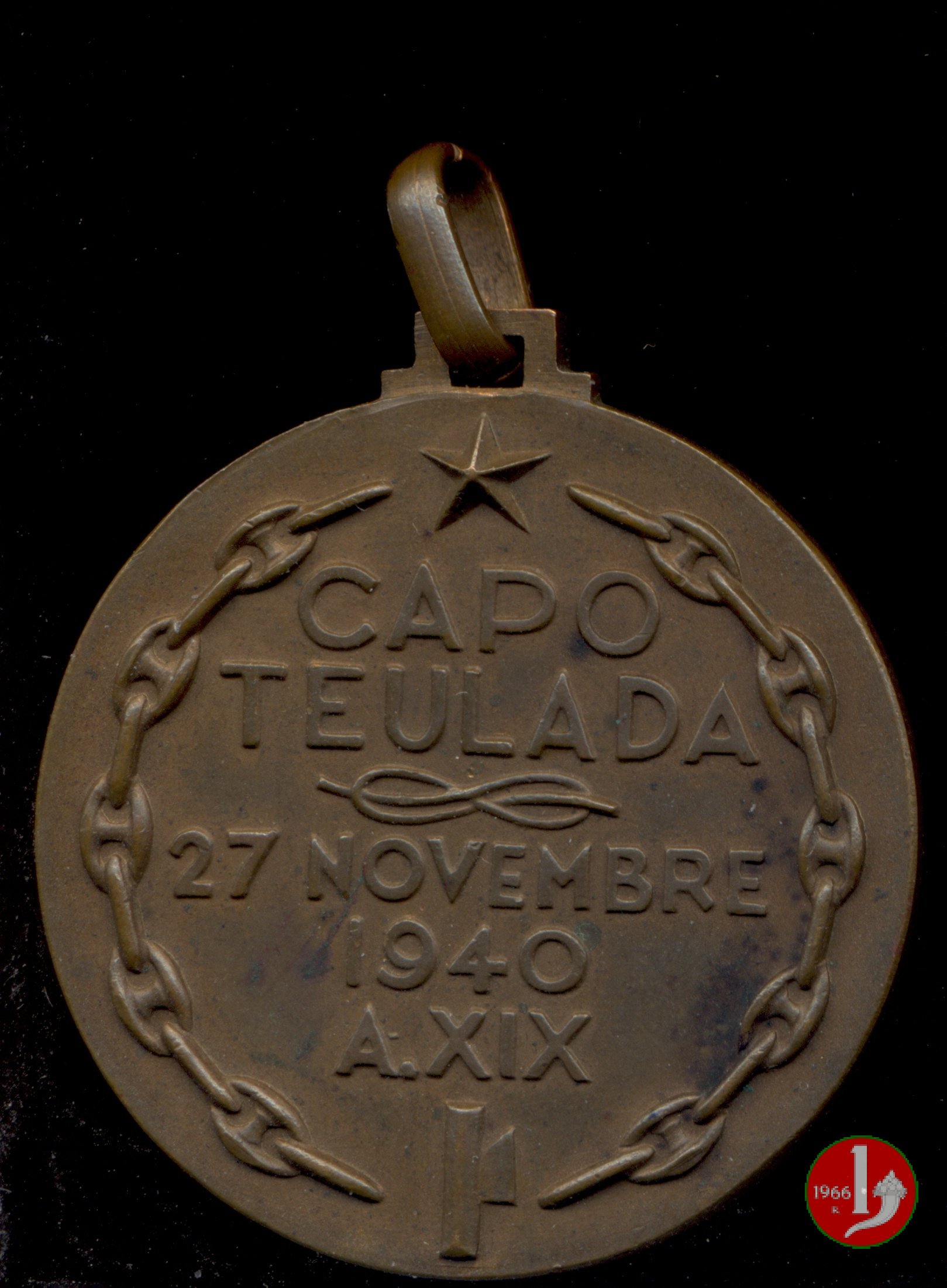 Verso: entro catena interrotta in alto da stella e in basso da piccolo fascio verticale: CAPO = TEULADA = 27 NOVEMBRE = 1940 = A. XIX