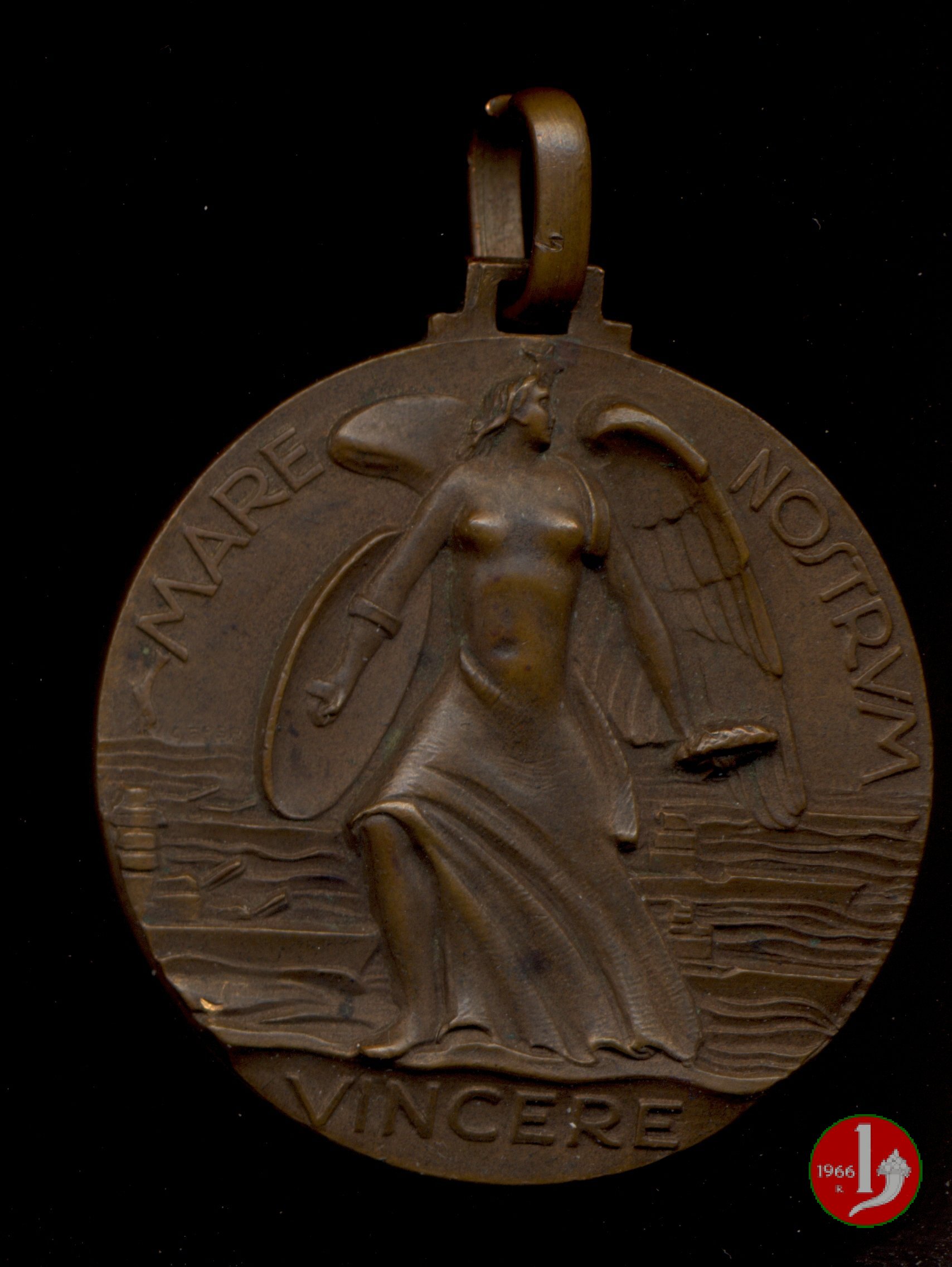 la figura allegorica della Vittoria alata, regge scudo; a dx navi entro mare