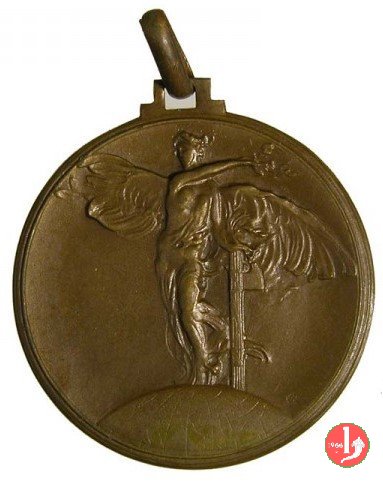 Dritto: La figura allegorica dell'Italia turrita regge fascio e pone serto d'alloro sul capo di ciclista in piedi