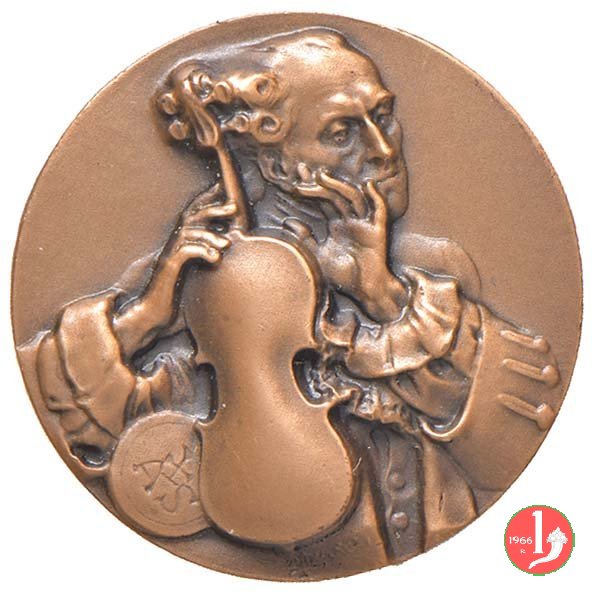 Dritto: composizione con violino al centro con spartito a dx tra tre medaglioni con i busti di celebri personaggi della storia di Cremona: MONTEVERDI CLAVDIO _ STRADIVARIVS _ ANONIVS CAMPVS 1525 1587