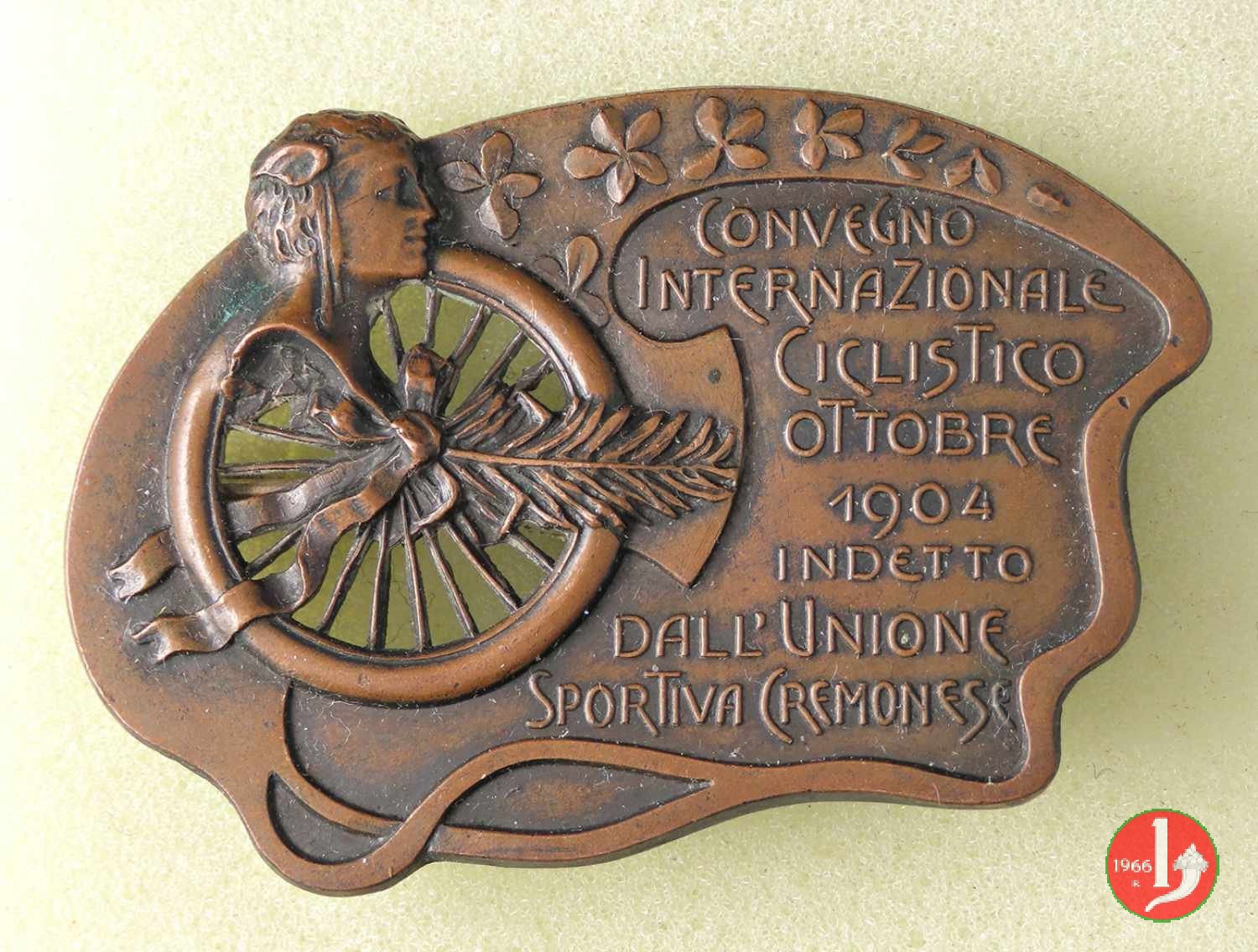 nel campo entro sagoma curvilinea e irregolare sormontata da foglie: CONVEGNO = INTENAZIONALE = CICLISTICO = OTTOBRE = 1904 = INDETTO = DALL'UNIONE = SPORTIVA CREMONESE
