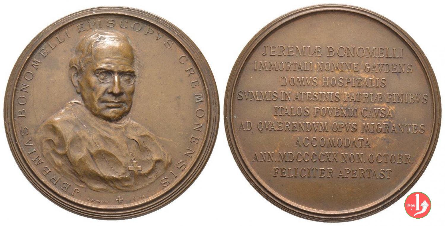 Verso: nel campo: JEREMIA BONOMELLI = IMMORTALI NOMINE GAVDENS = DOMVS HOSPITALIS SVMMIS IN = ATESINIS PATRIAE FINIBVS ITALOS = FOVENDI CAVSA AD QVAERENDVM = OPVS MIGRANTES = ACCOMODATA = ANN. MDCCCCXX NON. OCTOBR. = FELICITER APERTAST