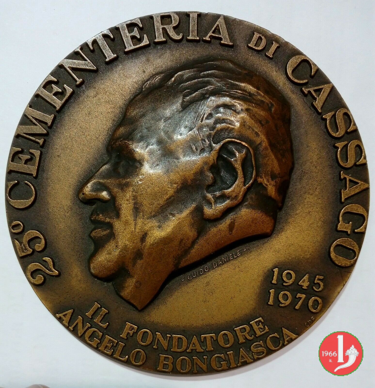 Cassago - 25° Anniversario della Cementeria 1970 Dritto: 25° CEMENTERIA DI CASSAGO testa a sx di Angelo Bongiasca sotto: - GUIDO DANIELE - nel campo a dx: 1945 = 1970 in basso su due righe: IL FONDATORE = ANGELO BONGIASCA | |