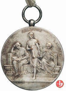 Lecco - Collegio Alessandro Volta Dritto: STVDIO ASSIDVITA' LAVORO Tre figure su panchina in esero, a sx: S. JOHNSON | |