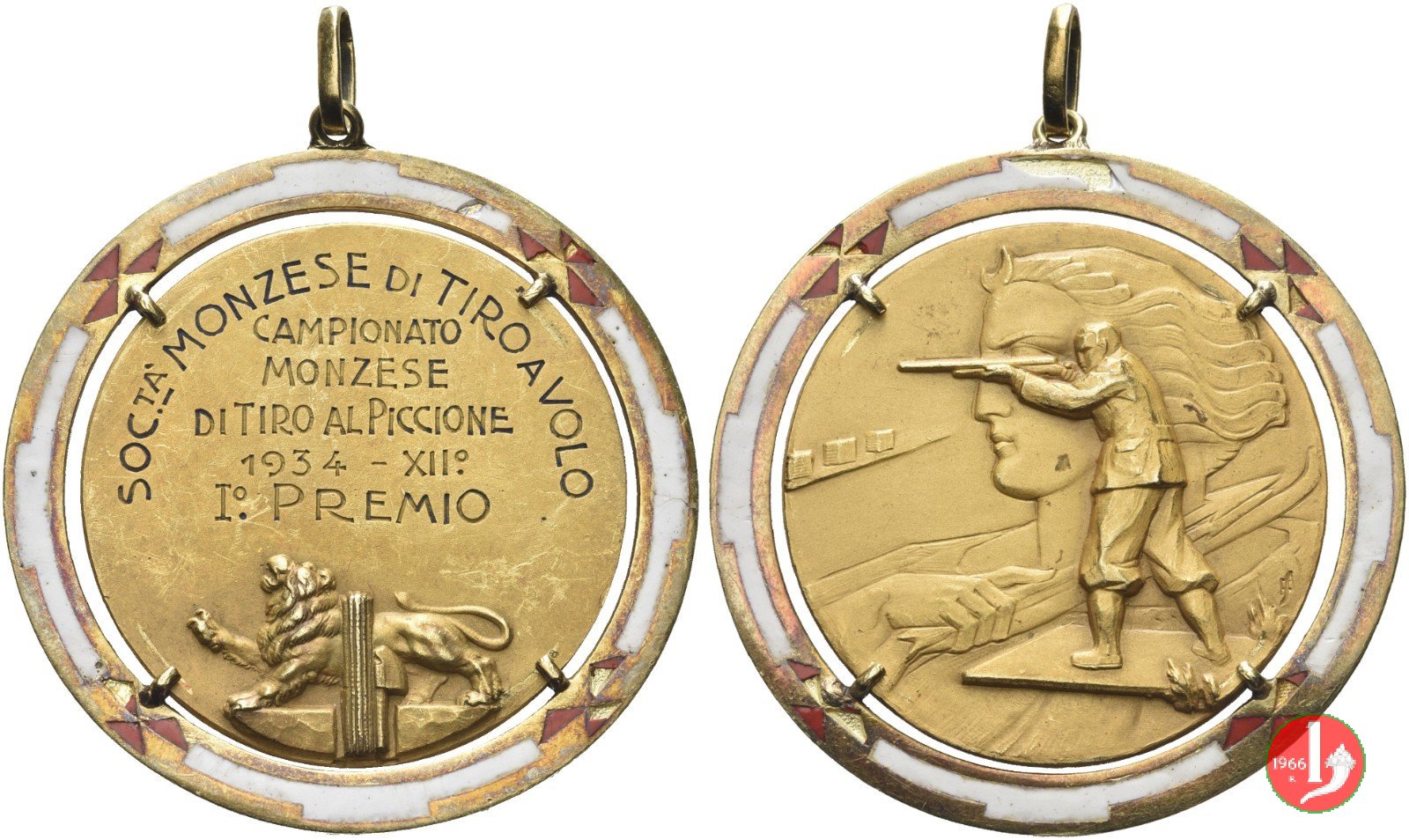 Tiro al Piccione 1934 -C- Dritto: Tiratore volto a sx su piattaforma con allori agli angoli, mira preda col fucile puntato, sovrapposto alla testa della figura allegorica dell'Italia con mezza luna in fronte che regge due frecce a dx presso il bordo monogramma: fF SOC.TA MONZESE DI TIRO A VOLO nel campo: CAMPIONATO = MONZESE = DI TIRO AL PICCIONE = 1934 - XII = I° PREMIO in basso: fascio verticale con lama a dx su leone volto a sx | |