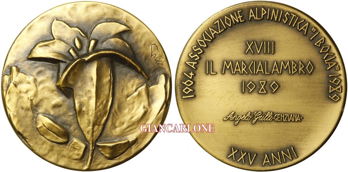Verano - Associazione I Bocia 1989 Dritto: fiore di Genziana a dx, presso il bordo: GRILLI nel campo: XVIII = IL MARCIALAMBRO = 1989 = Angelo Grilli • GENZIANA • in basso circolarmente: XXV ANNI | |