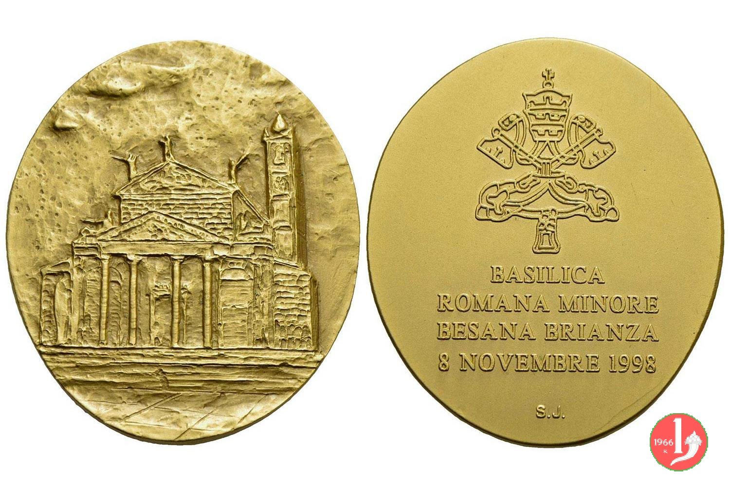 Besana Brianza - Basilica SS. Pietro Marcellino ed Erasmo 1998 Dritto: Vista anteriore della Basilica dei Santi Pietro Marcellino ed Erasmo a Besana in Brianza Verso: in alto: triregno su chiavi decussate nel campo: BASILICA = ROMANA MINORE = BESANA BRIANZA = 8 NOVEMBRE 1998 in basso: S.J. | |
