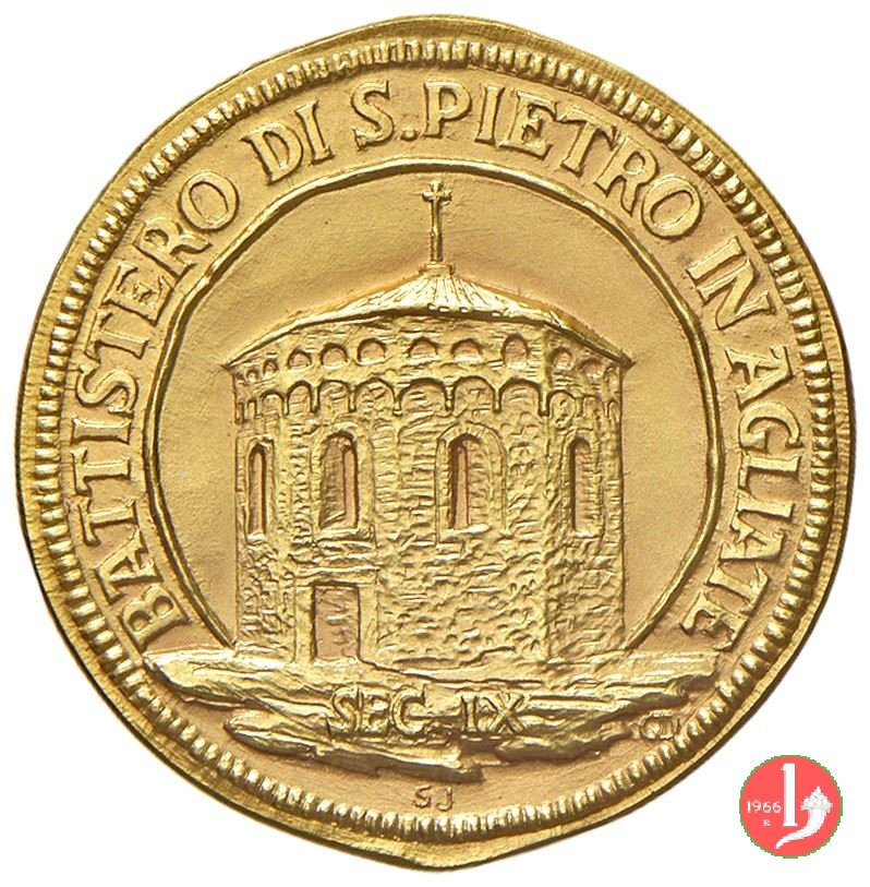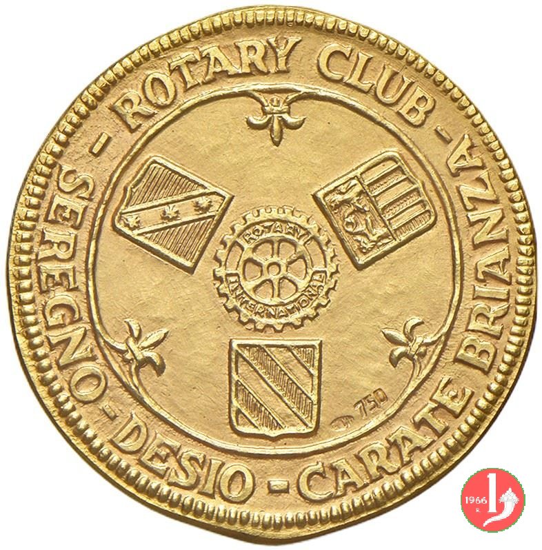 Agliate - Battistero di S. Pietro Dritto: BATTISTERO DI S. PIETRO AGLIATE entro cornice circolare continua invasa: vista del battistero di Agliate sotto: SEC. IX in basso a dx: CM (?) in esergo: SJ entro cornice circolare con tre gigli: lo stemma del Rotary International al centro tra gli stemmi di Seregno, Desio e Carate Brianza |