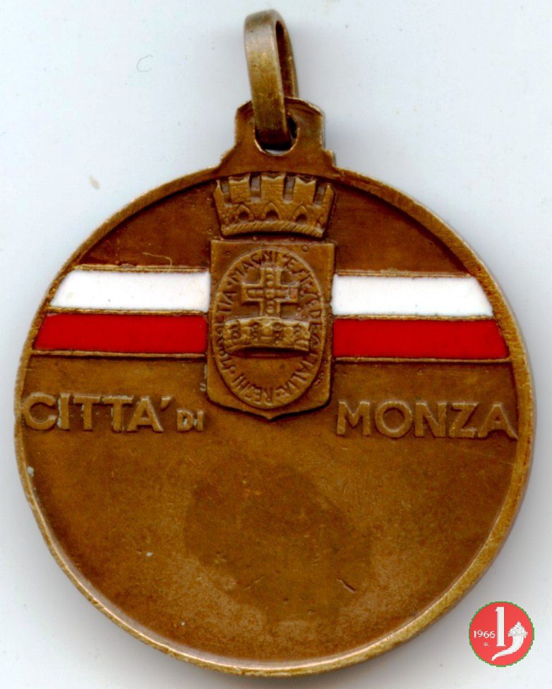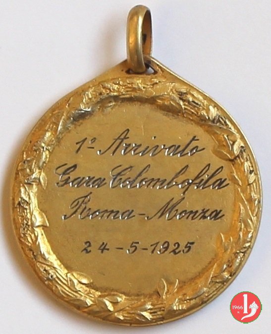 Premio Gara Colombofila 1925 Dritto: Stemma coronato della città di Monza con croce su corona ferrea, entro ovale su cui la legenda: ✠ EST SEDES ITALIAE REGNI MODOETIA MAGNI Verso: nel campo, inciso: 1° ARRIVATO = GARA COLOMBOFILA = ROMA - MONZA = 24-5-1925 | |