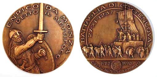 Enrico da Monza 1990 Dritto: ENRICO _ DA MONZA = DETTO _ IL METTIFOCO mezzo busto di 3/4 a dx del Mettifoco regge spada e scudo in basso, a dx: P. MONASSI entro cerchio interno: 27-XI-1237 il Carroccio, trainato da buoi verso sx sotto la linea dell'esergo, a dx: P.M. in esergo: logo del Circolo e ai lati 1980 _ 1990 in basso, circolarmente: CIRCOLO NUMISMATICO MONZESE | |
